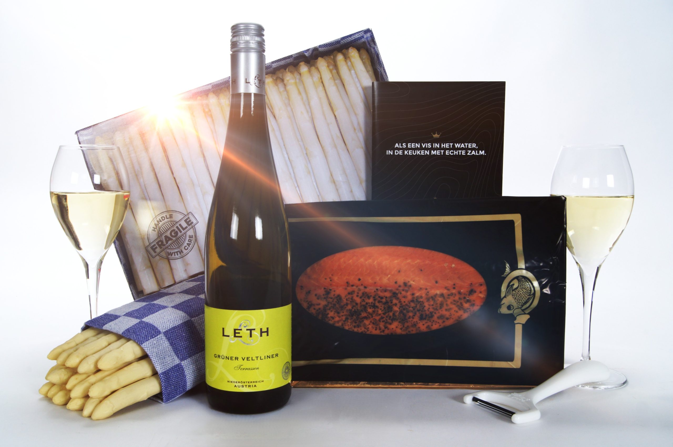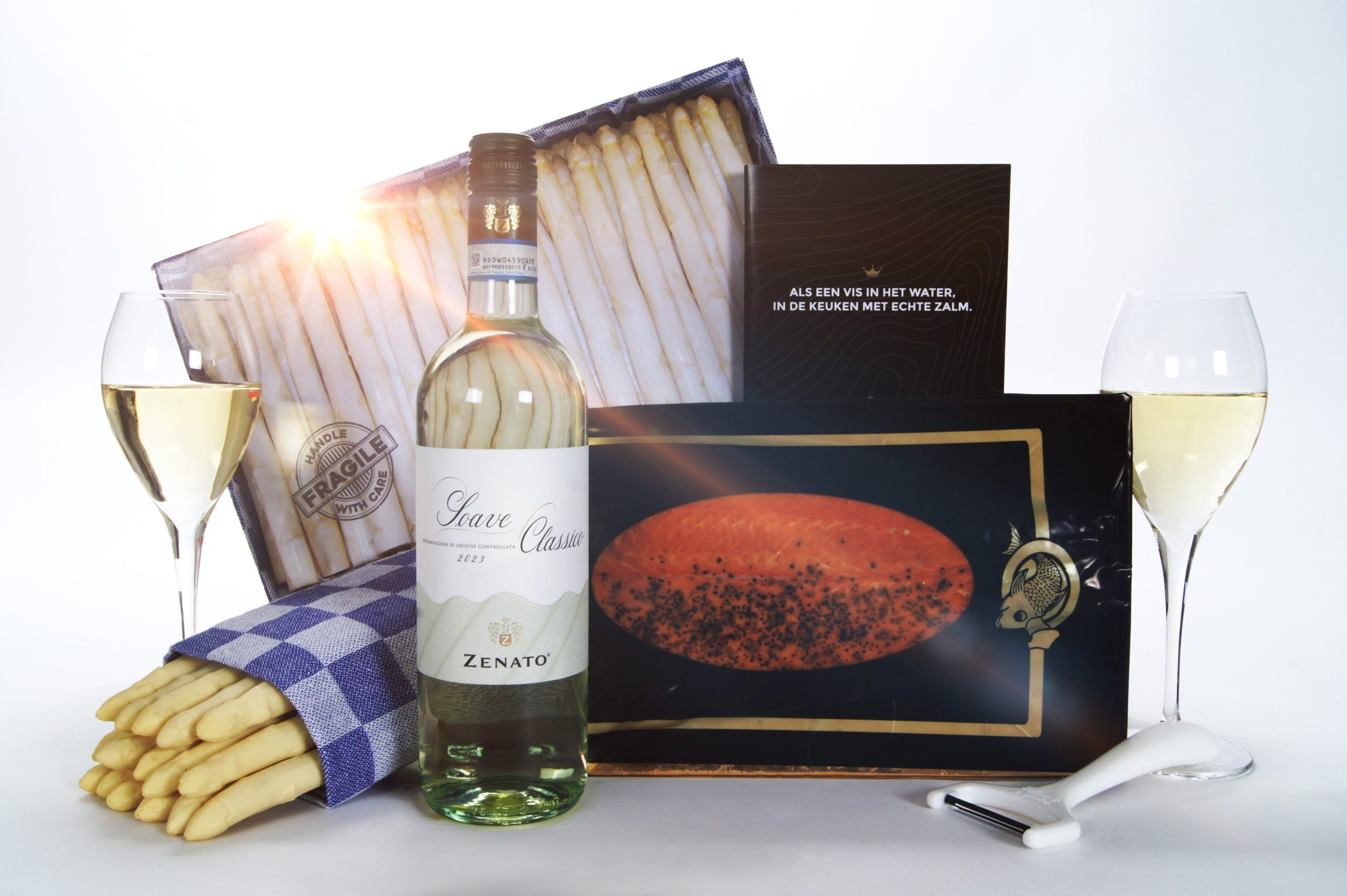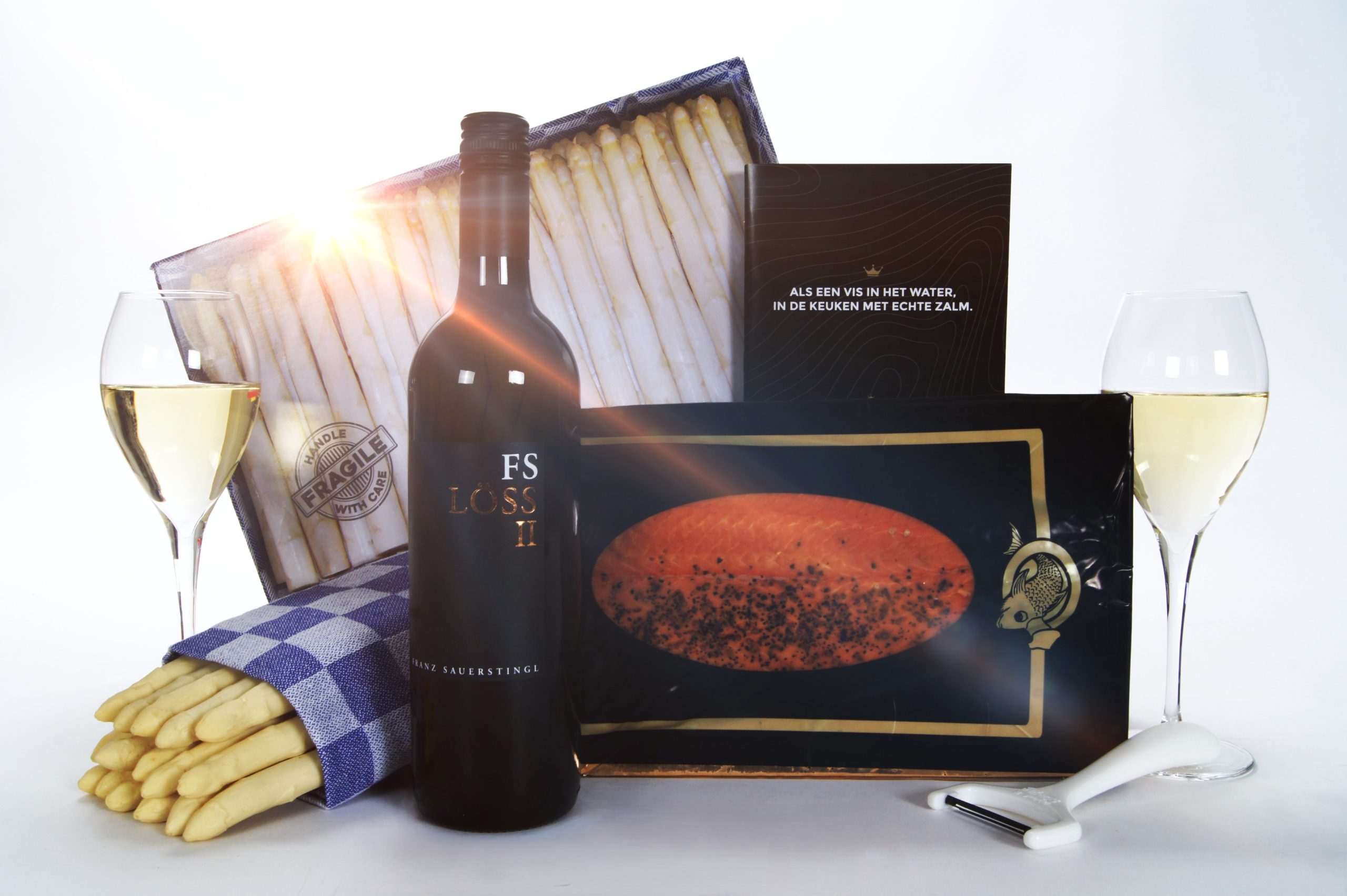 1 kilo Superior Queens gewikkeld in een mooie Aspergedoek en ca. 250 gram warm gerookte zalm verpakt in een super chique giftbox. De Asperges en de op ambachtelijke wijze gerookte zalm van topkwaliteit verpakken we samen met een Aspergeschiller (uit Sollingen) en de wijn in een hele gave geschenkdoos. De Superior Queen is een asperge die alle verwachtingen overtreft omdat ze op traditionele en duurzame wijze geteeld wordt, zonder gebruik van kunstmest, gewasbeschermingsmiddelen en dierlijke meststoffen. Met respect en waardering voor de natuur! De premium zalm komt uit de Noorse Fjorden en wordt met veel zorg op traditionele wijze gerookt in Spakenburg. Hét voorjaars cadeau voor medewerkers en relaties.