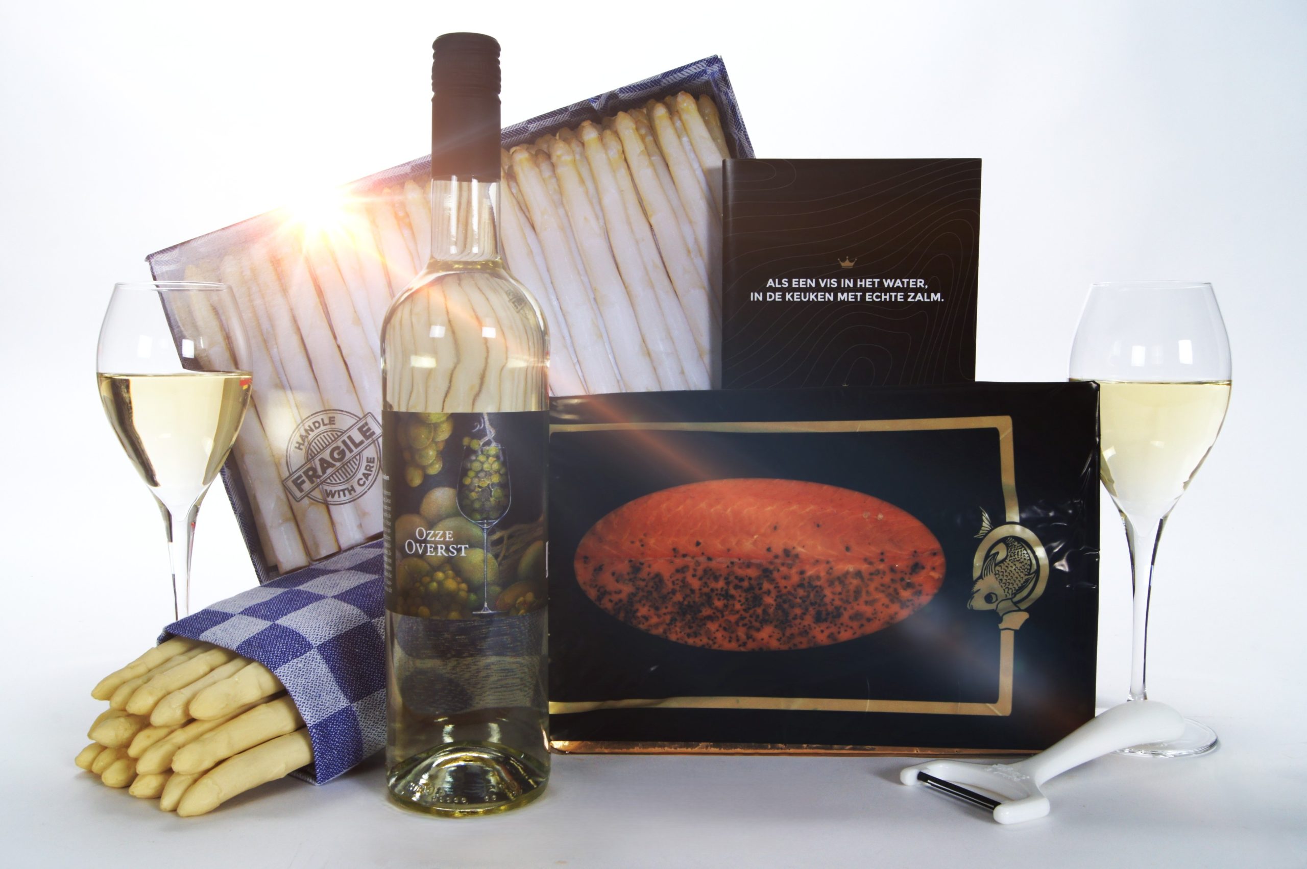 Landgoed Overst is gelegen in het Zuid-Limburgse Heuvelland tussen Voerendaal en Ubachsberg. Daar strekken de glooiende heuvels zich uit waarop sinds 2003 in totaal 11.000 wijnstokken zijn aangeplant. De kalkrijke bodem en het getemperde klimaat van deze regio bieden ideale groeiomstandigheden voor verschillende druivensoorten. De wijn is een unieke blend van Pinot Gris, Müller Thurgau en Auxerrois, die allen hiervandaan komen. De handgeplukte druiven worden na een koude vergisting vier maanden op staal gelagerd waarbij er door battonage maximale extractie van kleur, geur en smaak wordt bewerkstelligd. Door rijping op fijne gist smelten diverse elementen samen wat zorgt voor een vollere smaak. Vóór het bottelen wordt de wijn nog een keer gefilterd. De kleur is helder bleekgeel, met in de neus tonen van appel, peer, wit fruit en bloemen. Daarnaast is de mineraliteit duidelijk aanwezig. De smaak begint fris met mooie zuren; daarna fruitig met een volle smaak en lange afdronk. Ozze Overst is een fantastische, doordrinkbare cuvée die zich ook uitstekend leent als heerlijk apéritief. De wijn combineert goed met diverse vis-, schelp- en schaaldierbereidingen én -uiteraard- met Limburgse asperges. De premium zalm komt uit de Noorse Fjorden en wordt met veel zorg op traditionele wijze gerookt in Spakenburg. De zalm wordt daarna vacuüm verpakt om de versheid te garanderen en heeft een houdbaarheid van 2 weken. De zalm kan ongekoeld bewaard worden en is daarom een geweldige aanvulling op onze Aspergepakketten.