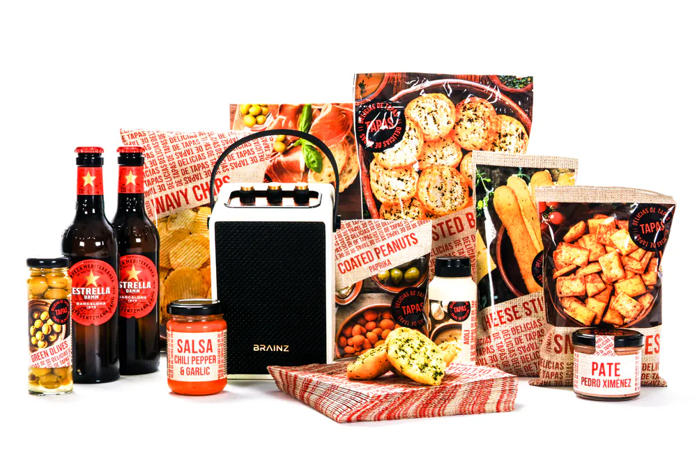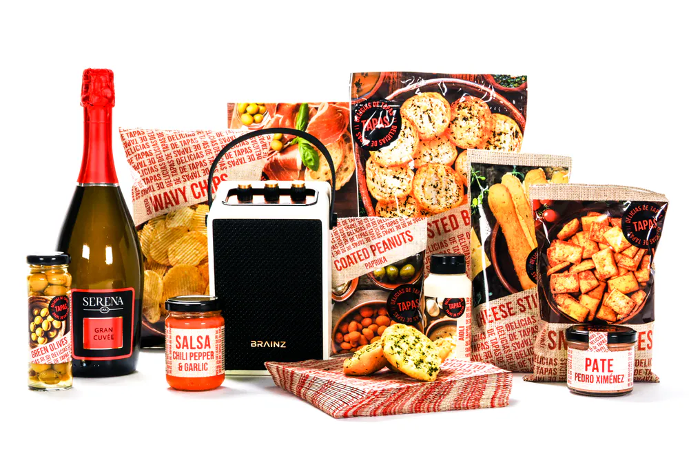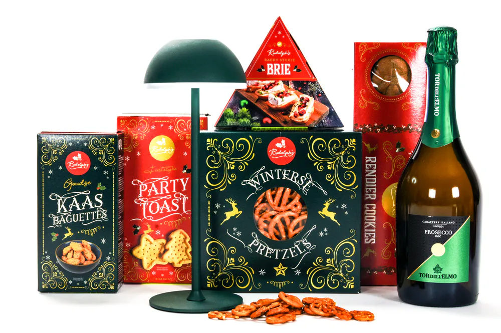 Geniet van de muziek met de **Brainz Speaker Rox in groen**. ideaal om je feestelijke playlist in de perfecte sfeer te brengen. Voor de hongerigen onder ons zijn er diverse culinaire lekkernijen van het merk Rudolph. Begin met de **Rudolph Ribbelchips zout** voor een heerlijke snack. De **Rudolph Brie** is perfect om te combineren met de **Party Toast** en geeft een luxe touch aan elk moment. Voeg daar de pittige **Goudse Kaas Baguettes** aan toe voor een heerlijke knapperige ervaring.