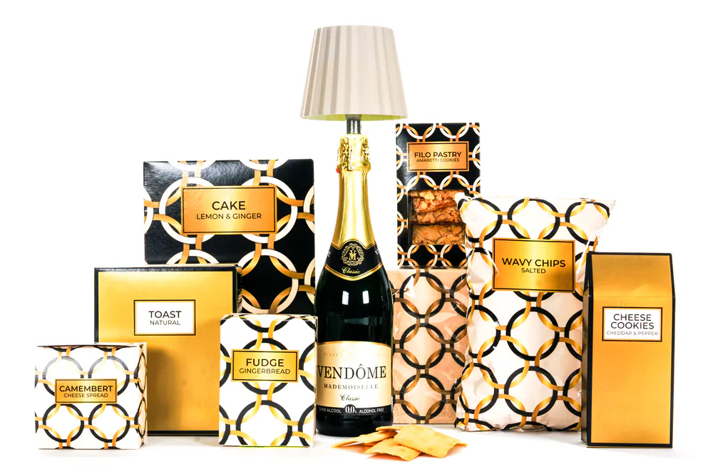 Verwen jezelf of een geliefde met de **Style de Luxe Cake van citroen en gember**. een perfecte balans van zoet en pittig. ideaal voor bij de koffie. De **Camembert Spread** en **Cheddarkoekjes** zijn heerlijke hartige toevoegingen. perfect voor een feestelijk toastmoment. Niet te vergeten zijn de knapperige **Filo Pastry Koekjes Amaretti** en de decadente **Fudge Speculaas**. die elke zoetekauw doen watertanden.