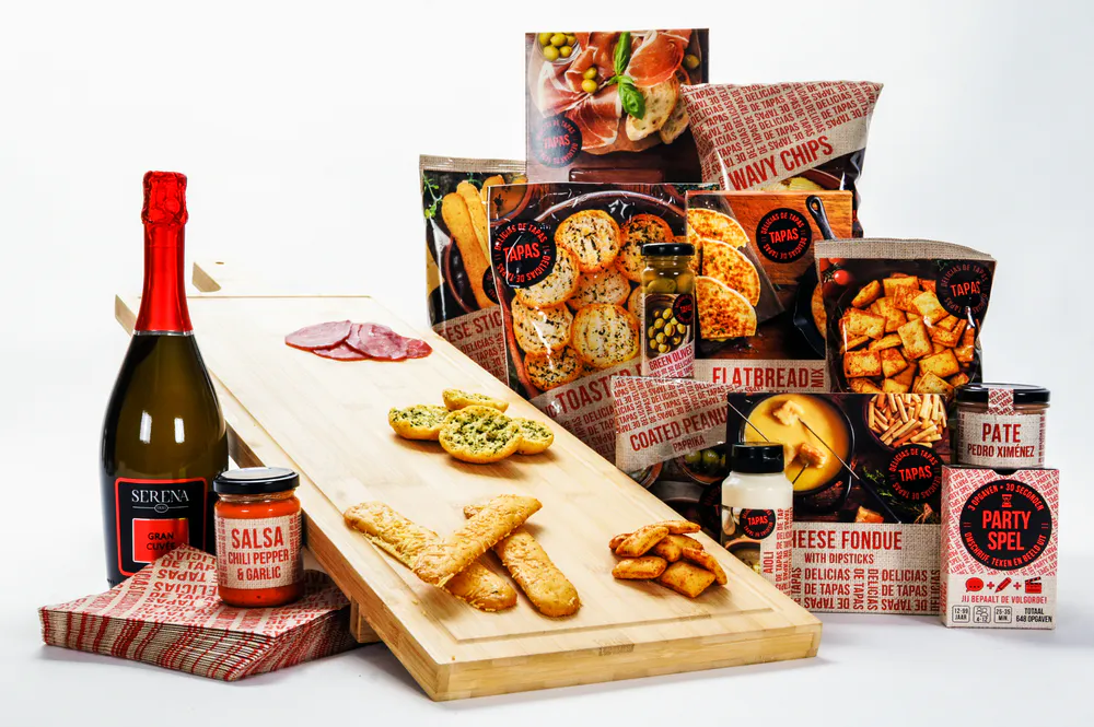 Verwen jezelf met de gezouten pinda's (100 gr) en de XXL melkchocoladereep met rozijnen en pinda's (225 gr) voor een zoete verrassing. Voor de snackliefhebbers zijn er de ribbelchips met zout (90 gr) en de toast (100 gr). perfect voor een borrelplank.