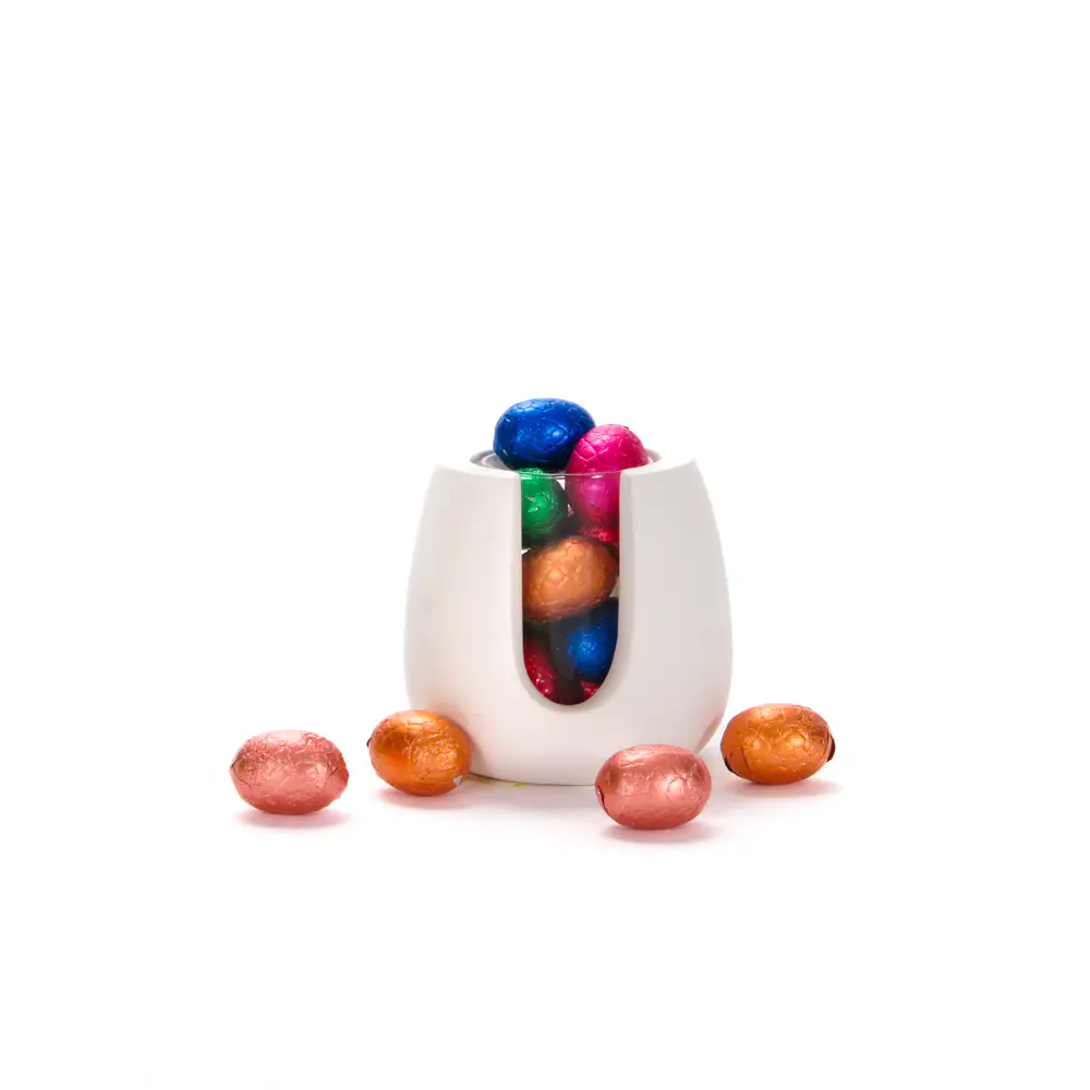 Deze ambachtelijke Paashaas in reliëf combineert romige witte chocolade met zachte melkchocolade in een speels, voorjaarsachtig ontwerp. Een stijlvolle Paasverrassing die meteen de aandacht trekt door zijn subtiele details en frisse uitstraling. Ideaal als premium Paasgeschenk voor medewerkers, relaties of als feestelijke traktatie tijdens het Paasweekend.