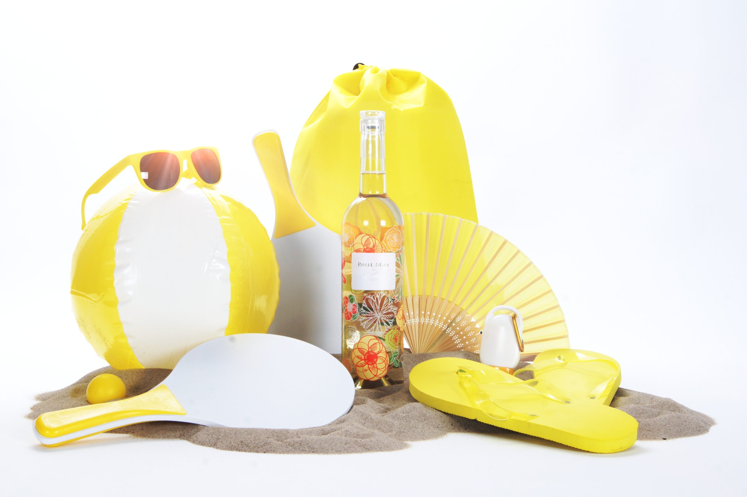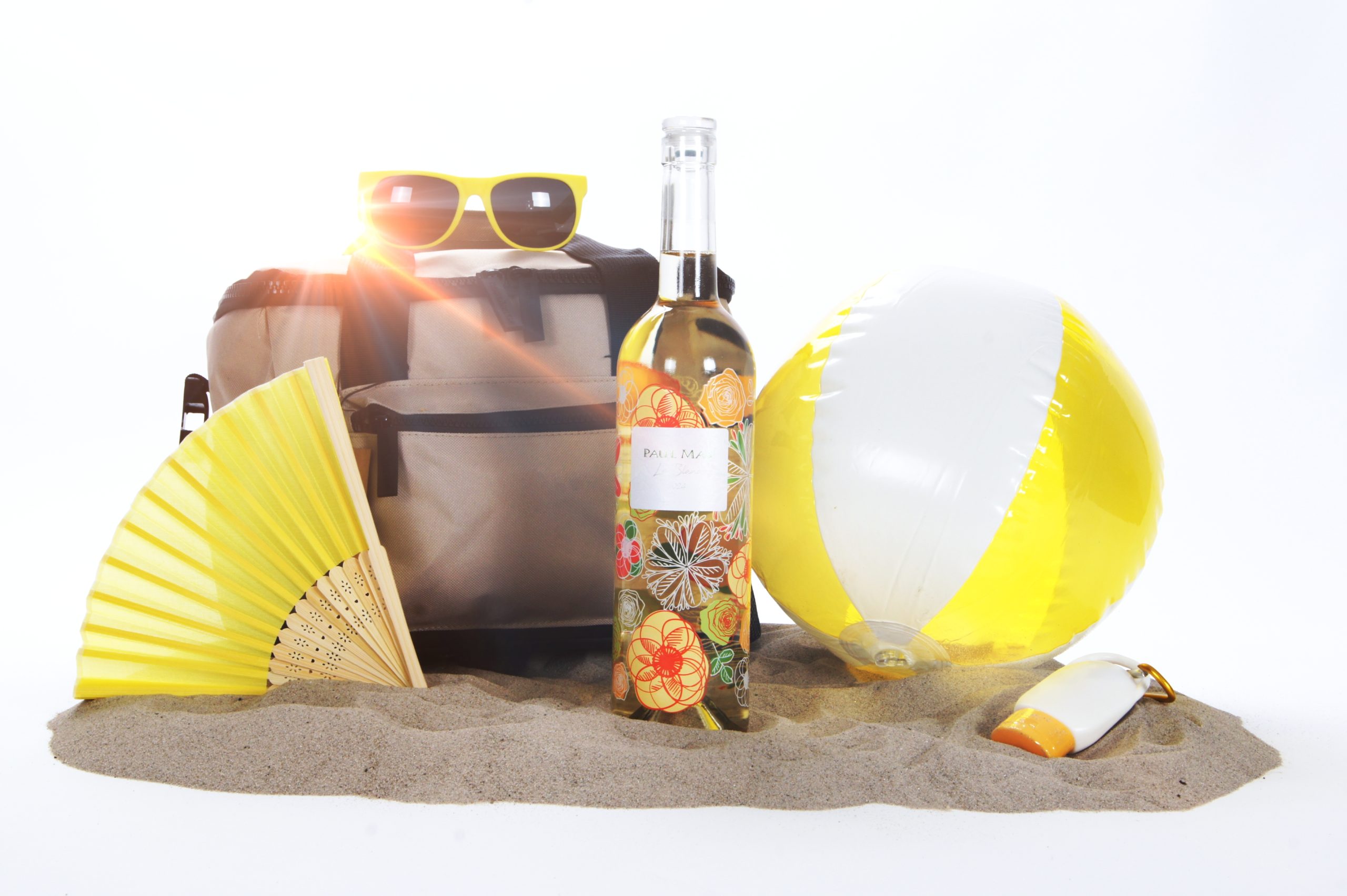 Zomer in een doos: strandbal, slippers, zonnebril, een koelrugzakje en zelfs een flesje wijn – alles wat je nodig hebt voor een zonnige dag, stijlvol verpakt.